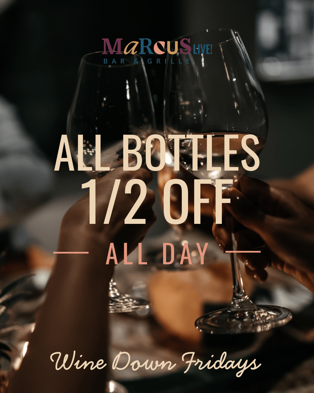 Sip, dance, and ease into the weekend with half off wine bottles every Friday at Marcus Live!